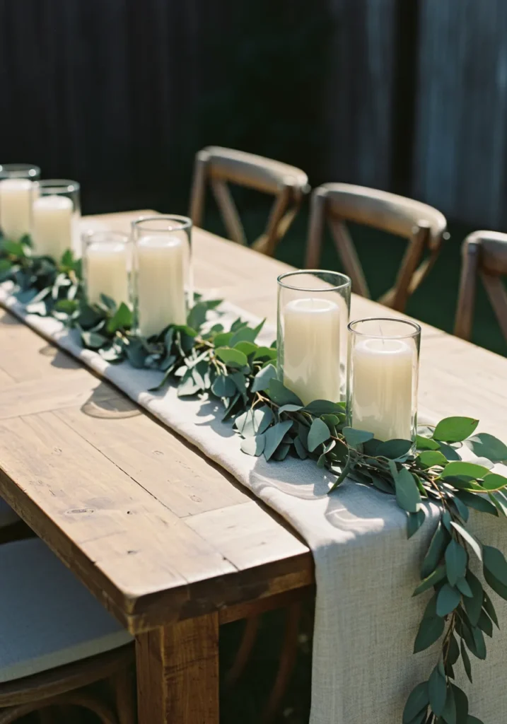 Tall glass hurricanes filled with creamy white candles line the center of a wooden table, surrounded by eucalyptus branches that trail over the edges. The combination of smooth glass, soft greenery, and rustic wood creates a beautiful mix of textures. It’s clean, calm, and perfect for both indoor and outdoor gatherings.