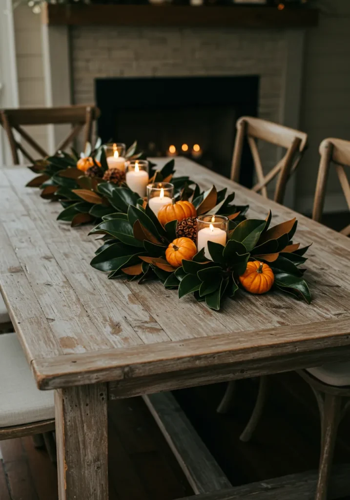 A rustic wooden table is lined with a lush garland of magnolia leaves, small pumpkins, and glowing candles nestled in clear glass holders. The deep green leaves and bright orange pumpkins bring such a rich autumn palette to life. Everything feels warm, natural, and beautifully balanced, with the candlelight flickering softly against the dark wood.