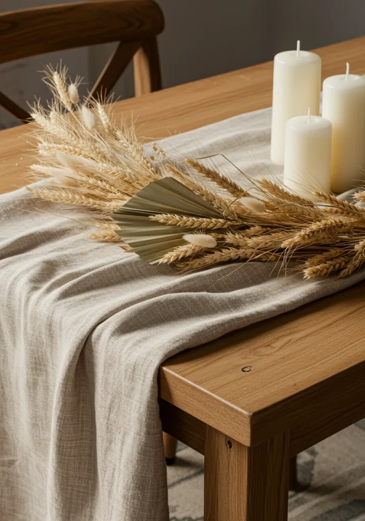 Neutral tones take the lead in this design, with a soft beige linen runner draped casually across a wooden table. A bundle of dried wheat and pampas grass rests beside a cluster of white pillar candles, creating a peaceful and earthy look. The overall style feels organic and effortless, as if everything just belongs there naturally.