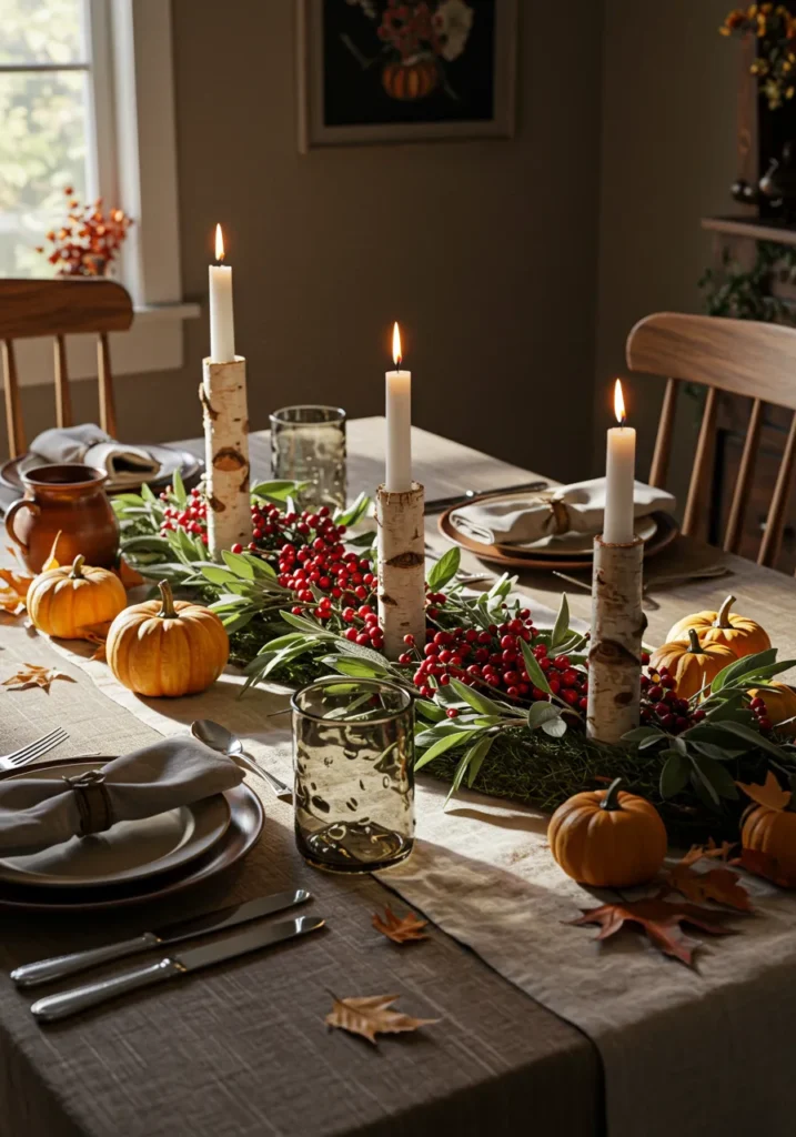 This table feels straight out of a countryside Thanksgiving dream. Birch candle holders with glowing white tapers rise above a lush garland of olive leaves, red berries, and tiny pumpkins. The layered textures—wood, greenery, and glass—create an inviting, nature-inspired look that feels festive yet grounded.