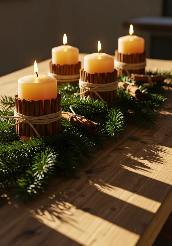 Soft candlelight glows through clusters of cinnamon sticks tied neatly with rustic twine. Each candle rests among fresh evergreen sprigs that stretch down a wooden table, creating a cozy and fragrant centerpiece. The warm tones of cinnamon and pine blend beautifully with the golden light from the flames, filling the space with that comforting holiday feel.