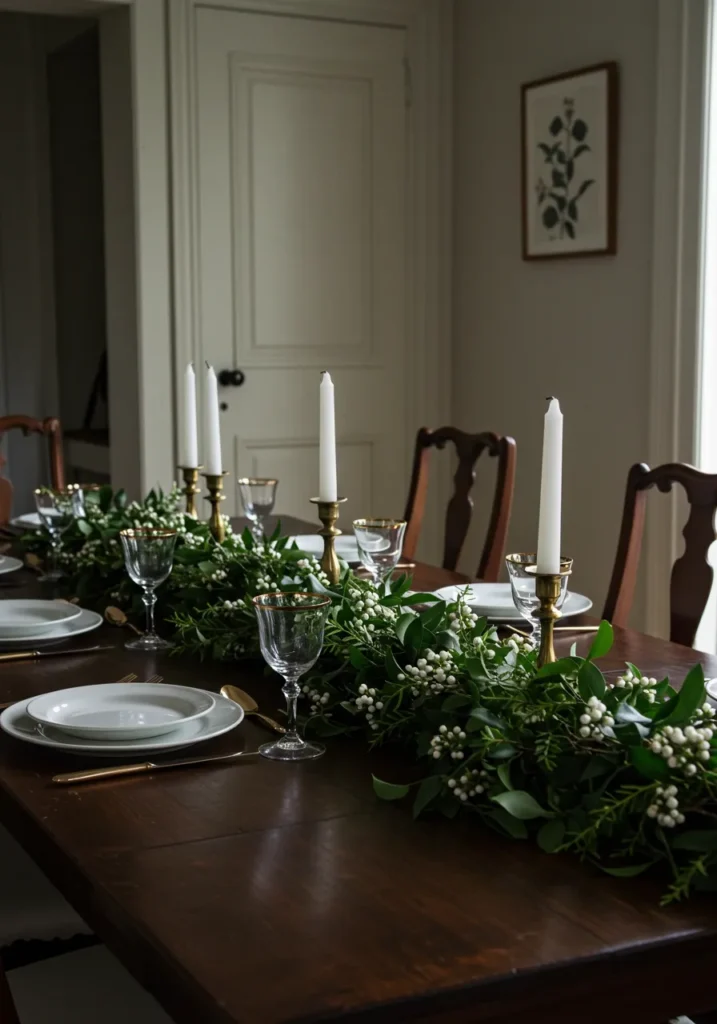 Elegant white taper candles rise from gold holders, their glow reflected in delicate glassware trimmed with gold edges. A thick garland of lush greenery and small white berries winds its way through the center, adding a fresh, organic touch. The setting feels refined yet inviting, combining timeless details with just the right amount of seasonal charm.
