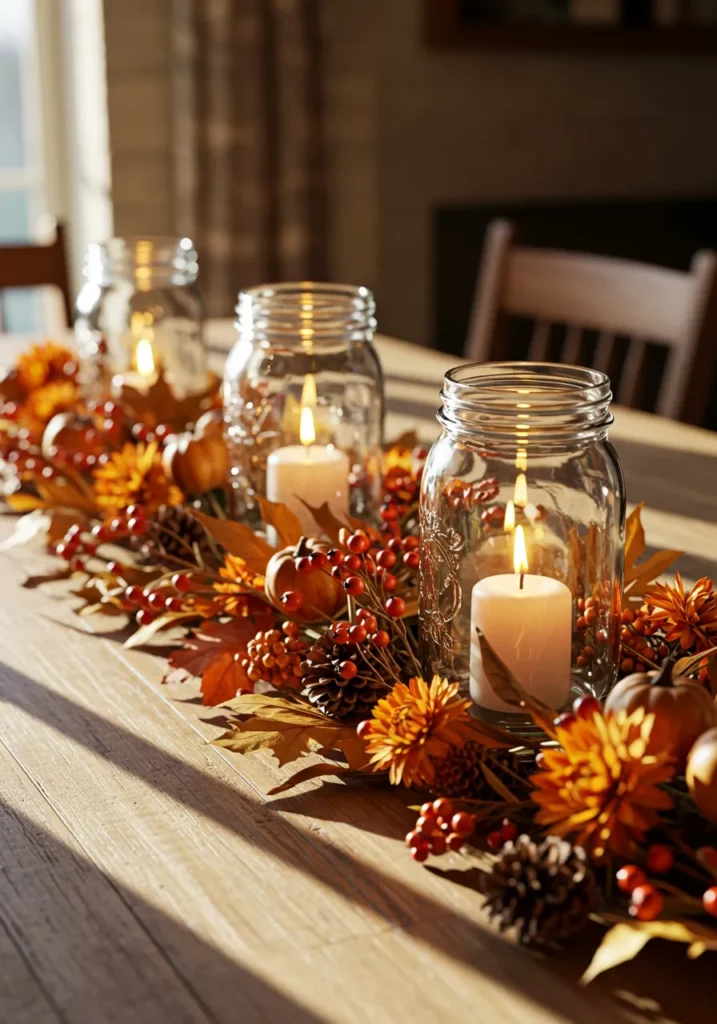 Mason jars filled with white candles sit surrounded by a colorful garland of orange berries, pinecones, and mini pumpkins. The table catches the afternoon light, and every flicker of the flame dances off the glass, bringing a touch of magic to the room. The mix of textures—smooth glass, crisp leaves, and rustic wood—creates a perfectly cozy autumn scene.
