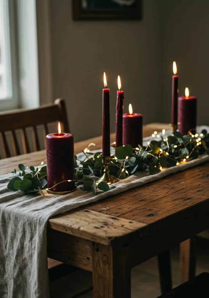 Rich burgundy candles in different heights line the center of a rustic wooden table, intertwined with a garland of eucalyptus leaves and tiny fairy lights. The deep color of the candles contrasts beautifully with the greenery, creating a moody yet romantic feel. The natural linen runner ties it all together, giving the design a grounded, relaxed vibe.