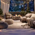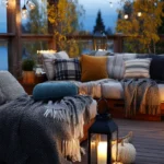 This beautifully designed above-ground pool exudes a cozy and rustic charm, featuring natural stone walls and a stunning wooden deck. The pool is complemented by a unique pergola structure with comfy seating, offering a perfect spot to unwind after a swim. Lush greenery surrounds the pool, creating a serene atmosphere that feels both secluded and connected to nature. The soft lighting adds an intimate touch, making it a lovely place to relax at night, enjoying the peaceful outdoors.