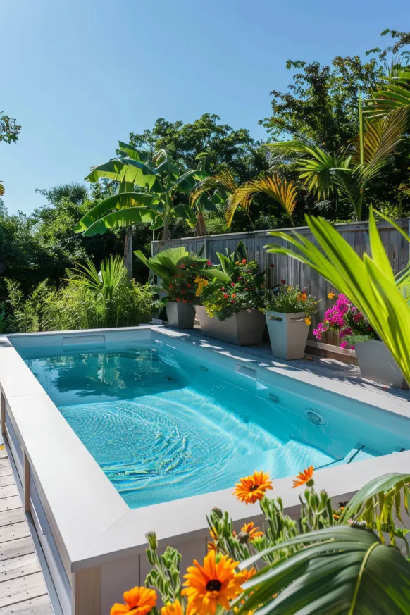 This above-ground pool sits surrounded by lush greenery and vibrant flower pots, creating an inviting tropical escape right in your backyard. The clean, modern lines of the pool are perfectly complemented by the natural beauty of large banana plants and the bright blooms of colorful flowers. The spacious deck, made of warm wood, adds a touch of elegance, while the arrangement of plants around the pool creates a seamless blend of tropical paradise and home comfort.