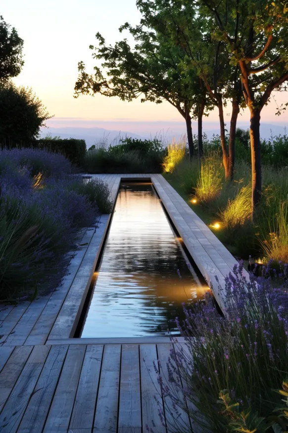 This sleek water feature design brings a modern twist to a traditional garden. A narrow water channel runs along a wooden walkway, framed by beautiful lavender and greenery, creating a serene, reflective environment. The soft lighting along the edges of the path adds a warm glow, highlighting the contours of the water as it catches the evening light. The natural elements blend seamlessly with the contemporary design, making it feel both peaceful and stylish.