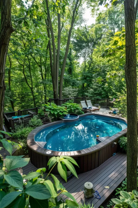 This stunning above-ground pool is perfectly nestled in the heart of nature, surrounded by lush greenery and towering trees that offer a sense of privacy and tranquility. The dark wood deck creates a warm, rustic atmosphere while complementing the rich, natural surroundings. The pool itself features soft curves that blend seamlessly with the landscape, and the entire space feels like a private oasis in the middle of the forest. Comfortable lounge chairs invite you to relax and enjoy the peaceful view, making it an ideal spot for unwinding in nature.
