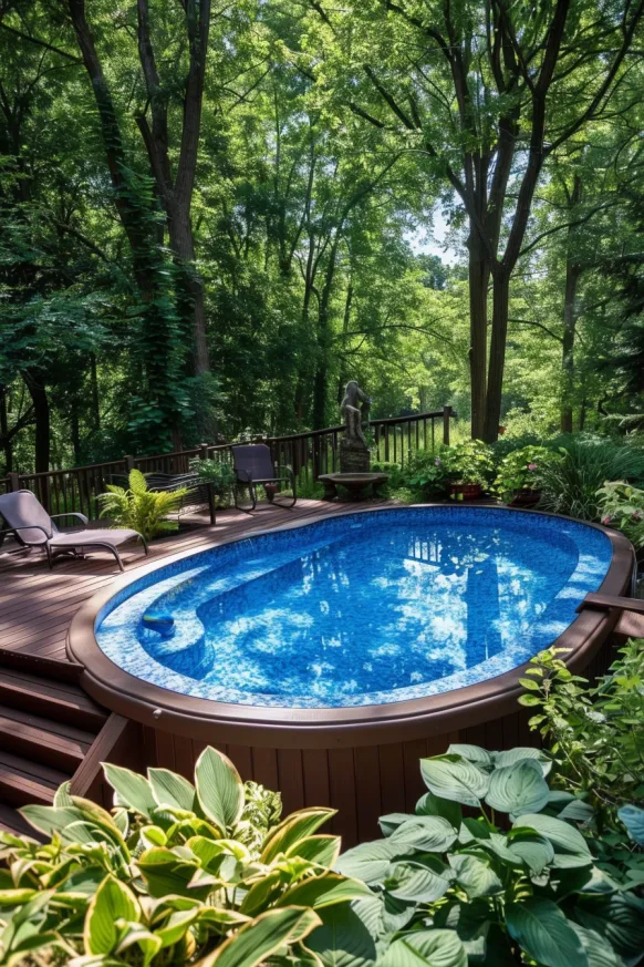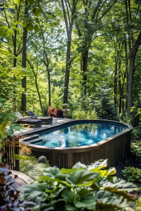 This above-ground pool design is perfectly integrated into a lush natural setting, offering a seamless blend of beauty and tranquility. The pool is surrounded by a spacious wooden deck, which is framed by vibrant greenery and soft foliage. A statue adds a touch of elegance to the scene, creating a peaceful ambiance. The high, mature trees surrounding the pool provide ample shade, while allowing just enough sunlight to make the water sparkle. The whole area feels like a private retreat, nestled within a beautiful, serene forest.