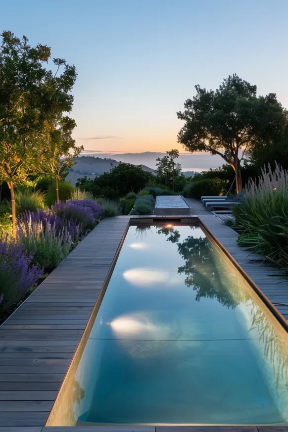 I’m completely captivated by the beauty of this design. The narrow pool feels so unique and chic, offering a serene and stylish vibe. I love how the lavender and other plants complement the sleekness of the pool, making the space feel like a calm retreat. The lighting is such a thoughtful touch, giving it an almost magical feel when the sun goes down. It’s simple yet sophisticated—a perfect blend of nature and modern design that makes you want to lounge by the pool all evening!