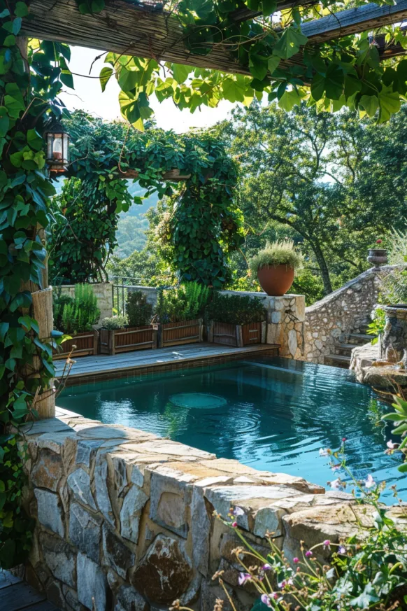 I absolutely love how this space feels like a hidden garden escape. The stonework and the vines give it an earthy, organic vibe, while the pool itself adds just enough sparkle to make everything feel luxurious. It’s the kind of place where you can relax and unwind, surrounded by beauty and nature. I can easily picture spending long afternoons here with a good book or a glass of wine—how perfect is that?
