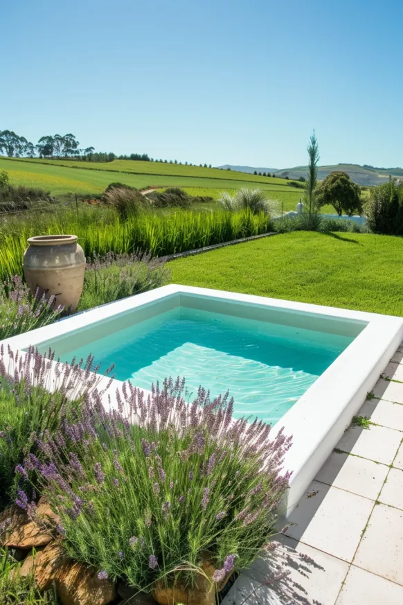 I’m completely drawn to this design for its understated elegance. The clean lines of the pool against the natural surroundings make it feel both luxurious and peaceful at the same time. I love how the lavender and the greenery frame the pool so beautifully, creating a serene space that feels like a quiet retreat. With that wide open view, it’s easy to imagine spending time here, soaking in the peaceful surroundings. This is a perfect example of how simplicity can create the most beautiful, calming spaces.