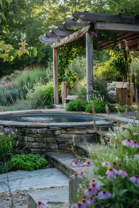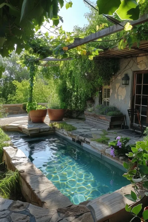 I’m completely in love with how this space feels so rustic and welcoming. The combination of stone, wood, and natural greenery creates a warm, homey vibe that makes it easy to imagine yourself lounging here for hours. The way the pergola offers both shade and style is a clever touch, and those little flowers peeking out around the pool? Absolutely perfect! It’s the ideal mix of natural beauty and comfort—so relaxing and easy to love.