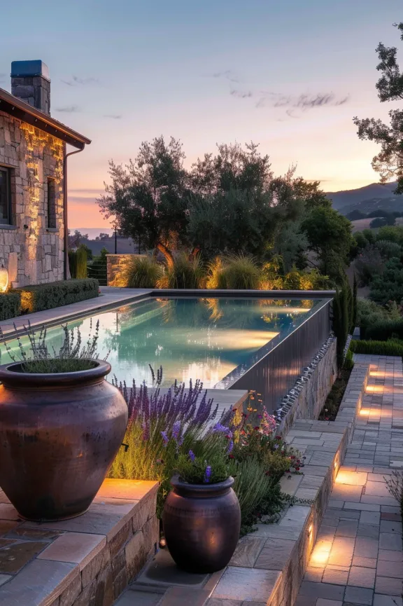 This poolside design exudes luxury with its sleek, modern pool surrounded by elegant stonework and vibrant landscaping. The pool is perfectly integrated into the space, with a seamless edge that reflects the surrounding greenery. Large, decorative pots filled with lavender and other lush plants create a peaceful, serene atmosphere. Subtle lighting along the pathway and around the pool enhances the elegance, especially as the sun sets and the lights begin to glow. The combination of natural stone, greenery, and sophisticated lighting creates a visually stunning and relaxing environment.