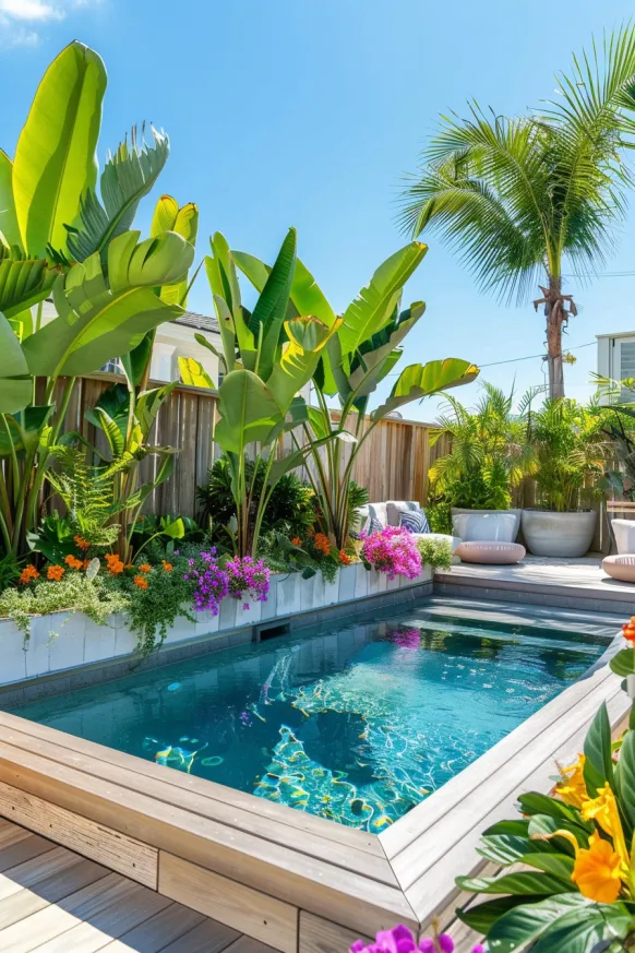 Surrounded by lush greenery and vibrant blooms, this above-ground pool is a dreamy backyard escape. The sleek wooden decking wraps around the pool, giving it a polished, modern feel while blending seamlessly with the surrounding tropical landscaping. Towering banana plants and palm trees create a private retreat, while pops of bright flowers add a playful, cheerful vibe. Cozy outdoor seating and oversized planters complete the look, making this space feel like a luxurious vacation spot just steps from the back door.