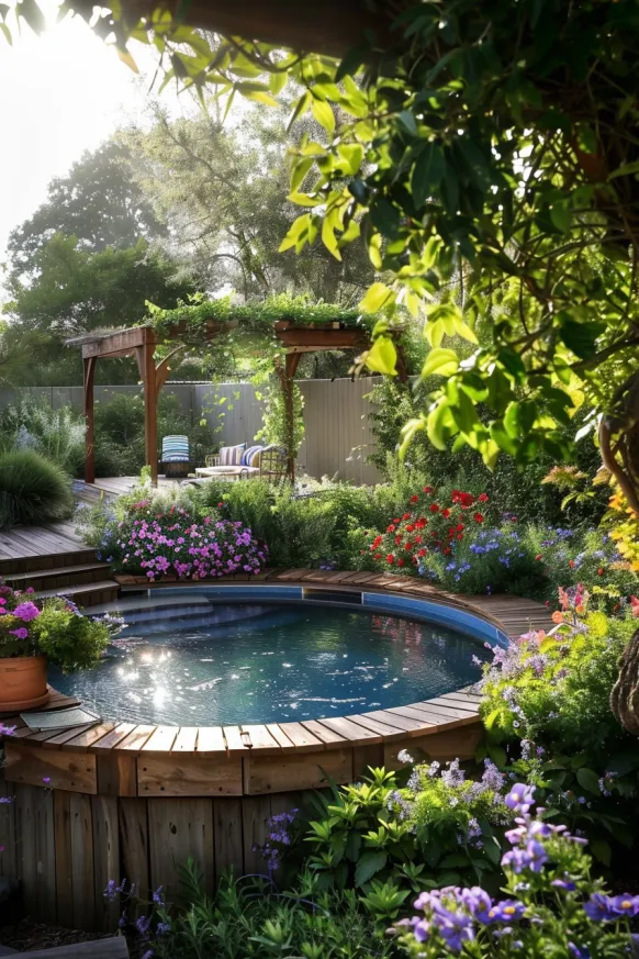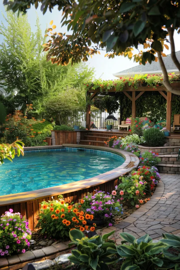 This above-ground pool design is surrounded by an explosion of color from the vibrant flowers that line its edges. The pool itself is framed with natural wood, adding warmth and rustic charm to the space. A cozy pergola in the background provides shade and a lovely spot to relax, while the lush garden surrounding the pool gives the entire area a peaceful, secluded vibe. The flowers in hues of pink, purple, and red create a vibrant, welcoming atmosphere, making the space feel like a private garden retreat.