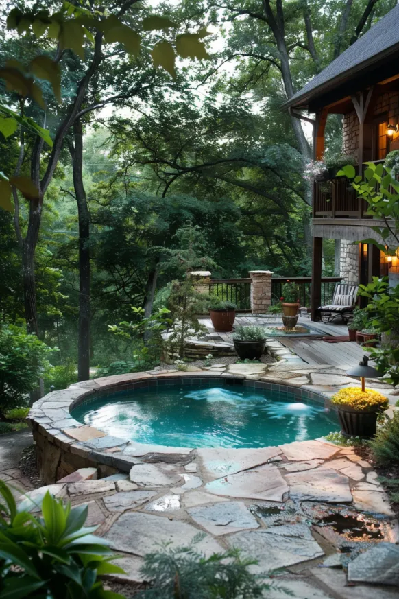 This cozy stone pool design feels like a hidden gem tucked away in nature. The pool is encircled by a beautiful stone border, blending seamlessly with the natural surroundings. The rustic stonework gives the pool a timeless and earthy feel, perfectly complemented by the surrounding greenery. Large trees and shrubs create a private, peaceful atmosphere, offering the perfect escape from the hustle and bustle of daily life. A charming wooden deck and a well-placed sitting area near the pool offer the ideal spot for relaxation or enjoying the outdoors.