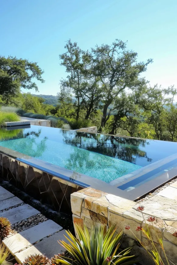 This breathtaking pool design features an infinity edge that creates the illusion of water spilling into the surrounding landscape. Positioned perfectly against a backdrop of trees and rolling hills, the pool merges seamlessly with nature. The stonework around the pool gives it a sophisticated look, while the clean lines and sleek materials highlight the modern architecture of the space. The carefully chosen plants and rock formations add texture and warmth, complementing the serene natural surroundings.