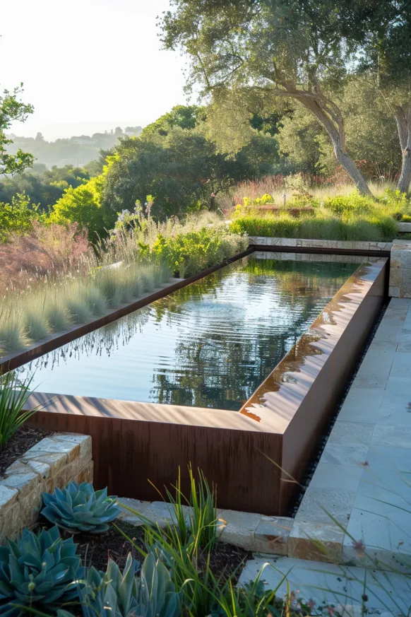 This beautifully designed pool features clean lines and a sleek, modern feel, blending seamlessly with the natural landscape. The long, rectangular shape of the pool, with its rust-colored steel framing, creates a striking contrast against the surrounding greenery and elegant stonework. The lush plants surrounding the pool add a pop of life and color, while the minimalistic design keeps the focus on the tranquil waters. With the serene hills in the background, the infinity-style edge further enhances the beauty of the space.