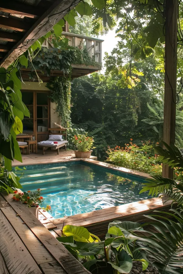 I can’t get enough of how peaceful and secluded this space feels—it’s like stepping into a secret garden. The combination of natural wood, vibrant foliage, and the soothing water creates a calming retreat perfect for relaxation. I love how the design brings the outdoors in, blurring the lines between the pool and the surrounding forest-like atmosphere. It’s a beautiful and inviting space that makes me want to cozy up with a book and let time drift by.