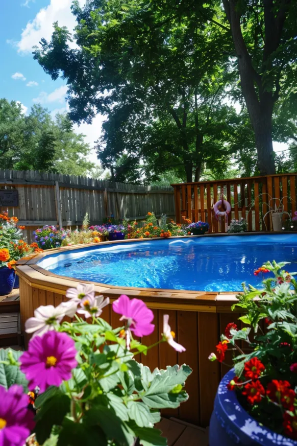 This above-ground pool design is a true celebration of color and nature. The pool is surrounded by a vibrant array of flowers in bright hues, creating a cheerful, garden-like atmosphere. The lush greenery and towering trees in the background further enhance the sense of peace and privacy, while the wooden deck and surrounding flower pots add a rustic charm. The wooden fence offers a sense of seclusion, making it feel like a private oasis that’s perfect for relaxing and enjoying the outdoors.