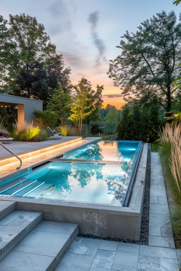 This above-ground pool design is the perfect blend of sleek modernity and luxurious elegance. The pool features clean, sharp lines with a minimalist stone surround, which gives it a sophisticated look. The lighting along the pool’s edge highlights the crisp edges, creating a stunning visual effect as the sun sets. Tall grasses and lush greenery provide a soft contrast to the structured design, adding a natural element without overwhelming the space. The surrounding deck is equally modern, offering a simple, elegant foundation for enjoying the beauty of the space.