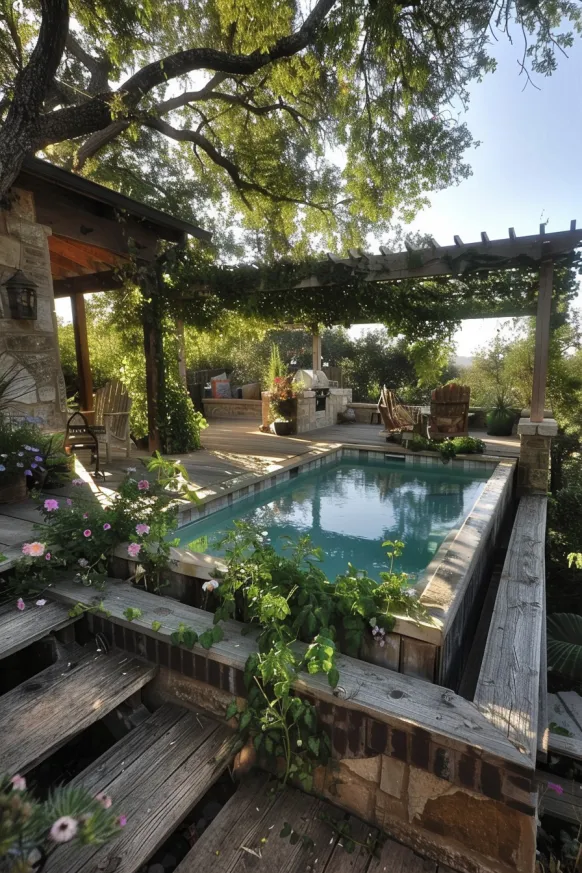 This intimate above-ground pool area is the epitome of relaxed elegance. With a natural stone surround and a vibrant, green backdrop, this space is all about blending with nature. The pool is framed by lush plants and colorful flowers, creating a charming, garden-like feel. Above, a pergola draped with climbing vines offers just the right amount of shade, making this poolside retreat feel cozy and inviting. The combination of stone, greenery, and the soft trickle of the pool’s water adds a tranquil, rustic touch to the overall design.