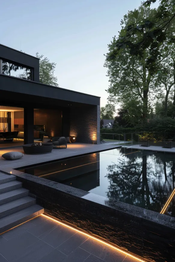 I can’t get enough of this design! The way the LED lights pop against the dark stone and the reflective water is just mesmerizing. The minimalistic vibe is so fresh and clean, yet still cozy enough for lounging by the pool. It’s a stunning, high-tech space that still feels comfortable and inviting. I can already imagine hosting a casual evening gathering with friends or just enjoying a peaceful night under the stars. This pool is a perfect balance of style and function—definitely a backyard upgrade I’d love to have!