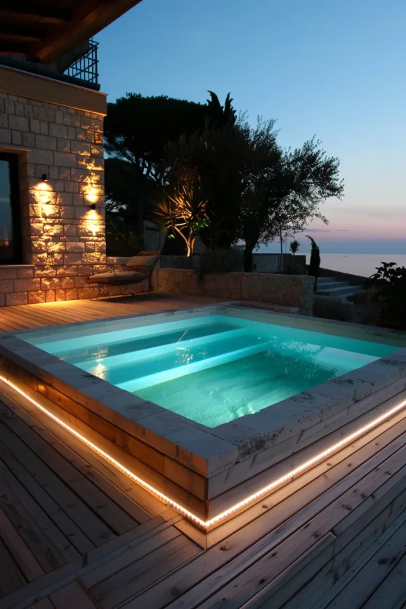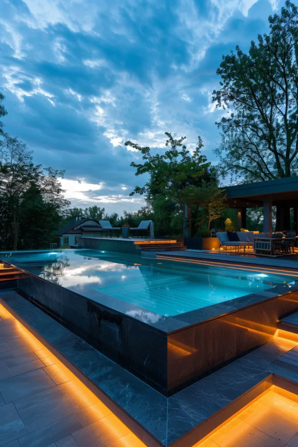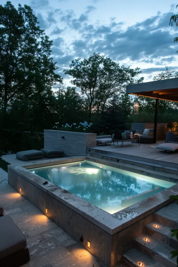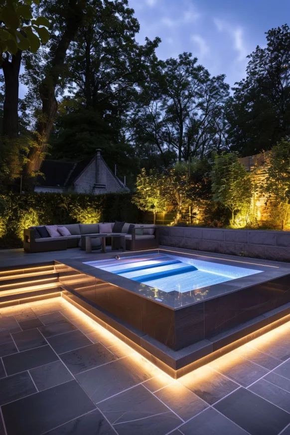 Stylish Pool Design with Step Lighting and Cozy Ambiance