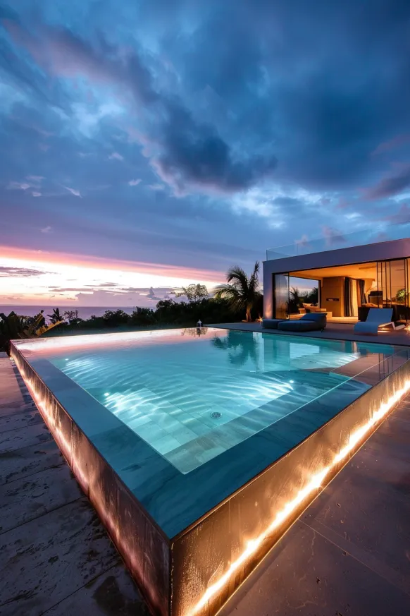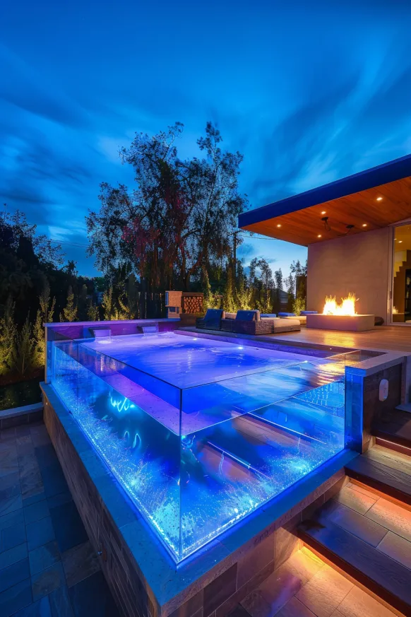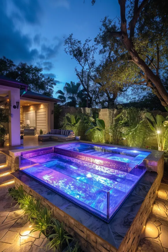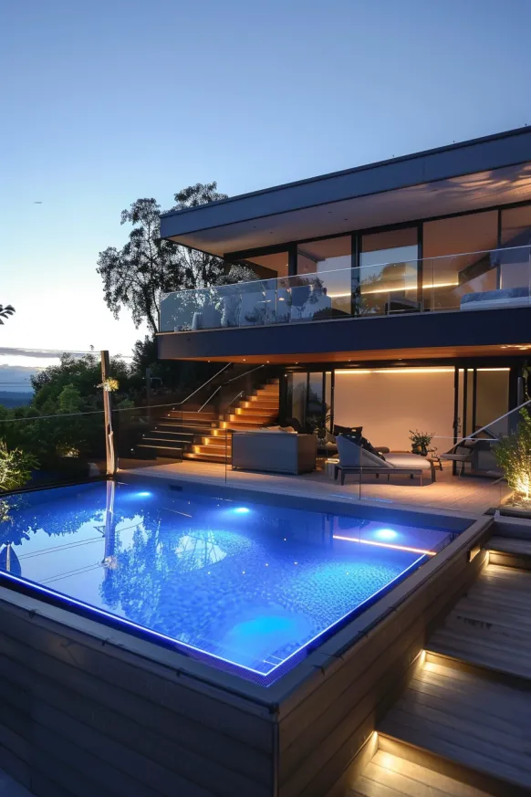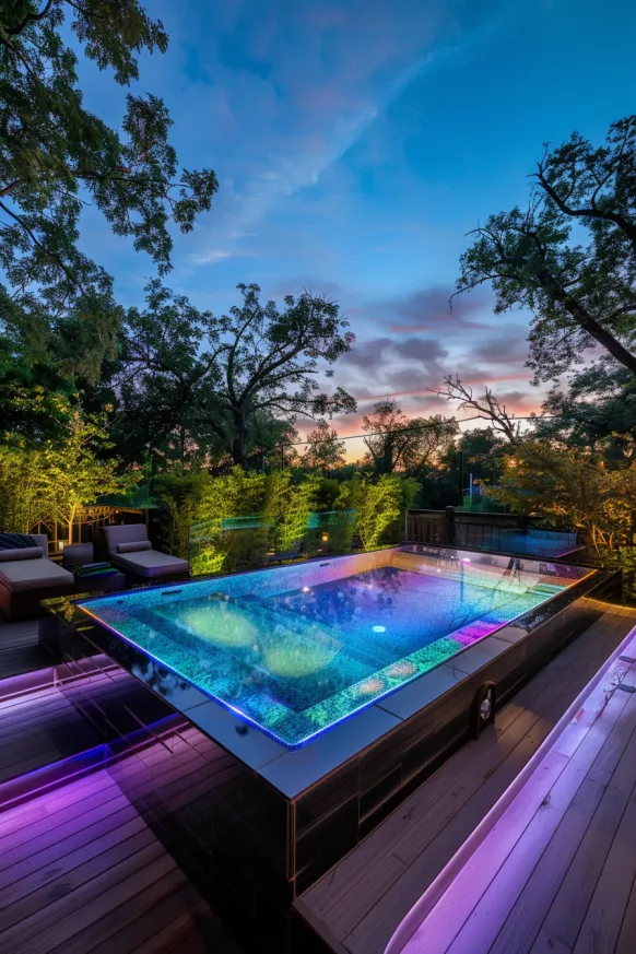 I can’t help but be enchanted by this design! The colorful LED lights are so playful yet sophisticated, adding such a dynamic energy to the space. The glass wall is such a clever touch—it gives the pool a sleek, contemporary feel while allowing you to enjoy the view of the water from any angle. Plus, the combination of the warm lighting around the pool and deck area creates such a welcoming vibe. It feels like a magical place where you could relax or entertain, with a style that’s both modern and effortlessly cool. I’d love to unwind here after a long day, sipping something refreshing while basking in the glow of the lights!