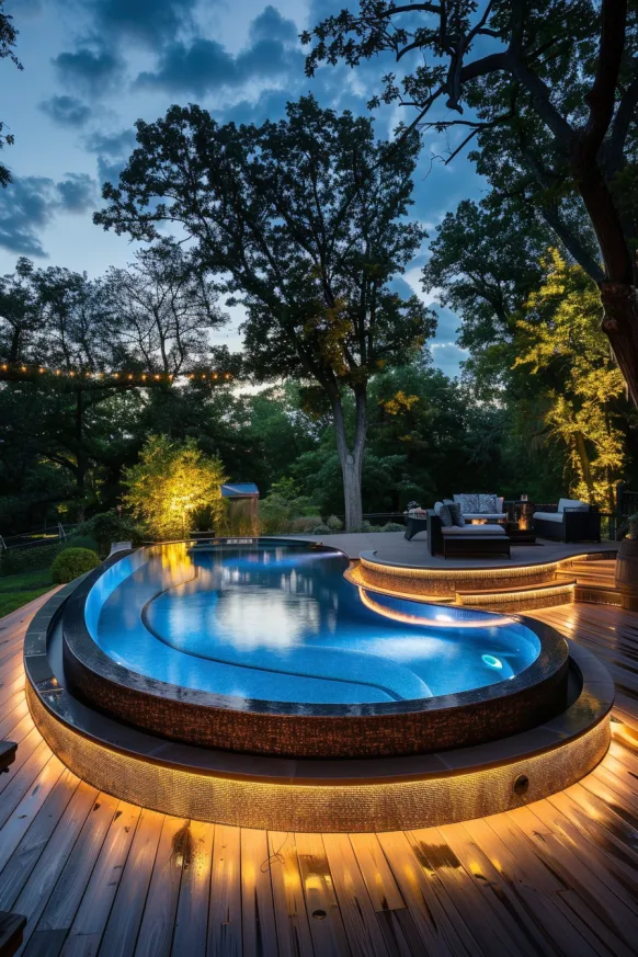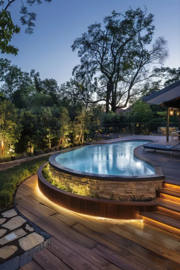 This above ground pool design is the perfect blend of elegance and tranquility. Its unique, curving shape gives it an organic feel, and the soft lighting around the pool’s edge highlights the contours beautifully, creating a dreamy glow in the evening. The lighting beneath the water adds another layer of magic, allowing the tiles to shimmer in hues of blue and white. Surrounded by simple, yet stunning greenery and a wooden deck, this space is designed to offer a serene, luxurious experience that makes it feel like a private retreat.