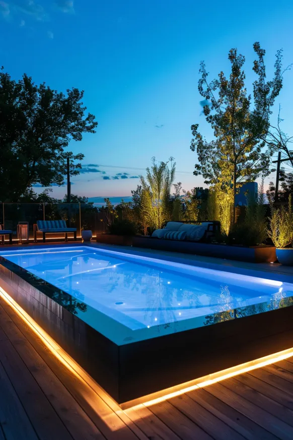 This above ground pool is beautifully framed with warm LED lighting, creating a cozy, inviting ambiance as dusk falls. The pool itself features a sleek, modern rectangular shape with a crystal-clear blue finish. The surrounding deck, made from rich wooden planks, is illuminated with soft lighting along the edges, which highlights the architectural beauty of the space while adding a touch of sophistication. Tall, lush plants surround the area, complementing the design and contributing to a serene and natural atmosphere.