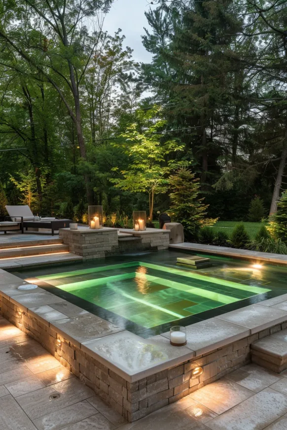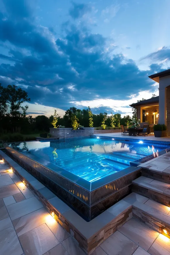 This above ground pool design is a perfect blend of modern style and cozy elegance. The pool features sleek, straight edges, with vibrant LED lighting outlining its shape, creating a glowing effect in the evening. The lighting along the steps adds an extra touch of sophistication, guiding you gently into the cool water. The surrounding stonework and minimalist landscaping enhance the serene atmosphere, while the soft lighting around the area gives it a warm, inviting glow.