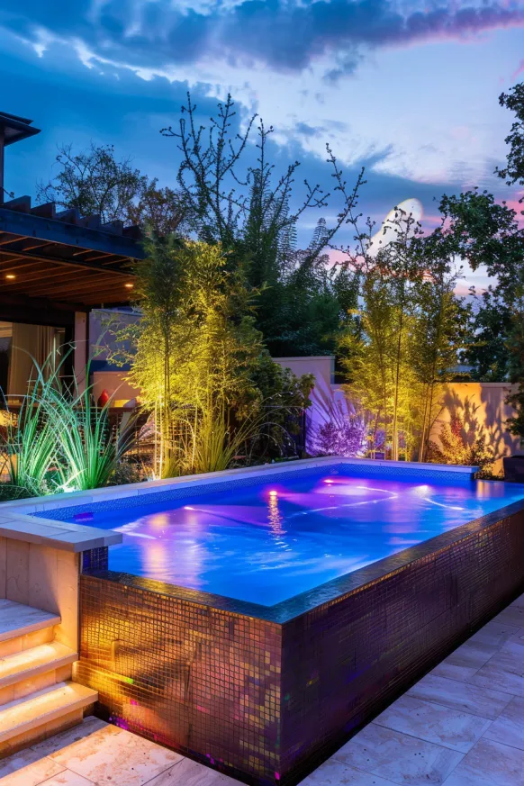 This above ground pool design is a showstopper, with vibrant lighting illuminating the space and adding a touch of drama. The sleek, black mosaic tiles surrounding the pool reflect the multi-colored lights beautifully, creating a shimmering effect in the water. The mix of soft and bright lighting around the plants adds a touch of mystery and allure, with the foliage softening the overall aesthetic. The design also features stone steps leading up to the pool, making it feel like a private oasis where you can escape from the everyday.