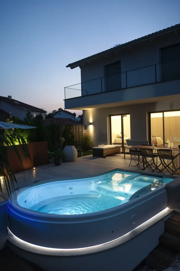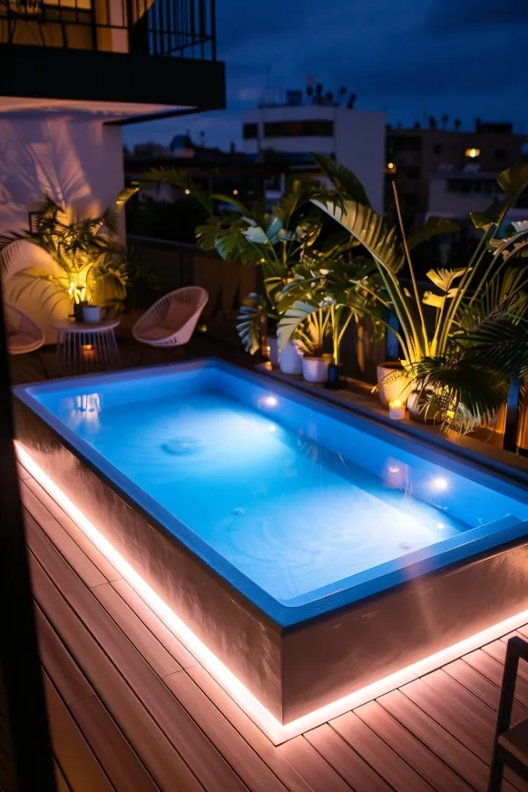 This compact and sleek above-ground pool is designed with modern elegance in mind. The pool’s smooth, curved lines and pristine white surface are complemented by soft, ambient lighting that wraps around its base, casting a gentle glow on the surrounding deck area. The lighting subtly enhances the pool’s contours, creating an inviting atmosphere that stands out beautifully against the evening sky. The pool’s minimalist aesthetic is paired with lush greenery and carefully arranged plants that add a touch of nature to the urban setting.