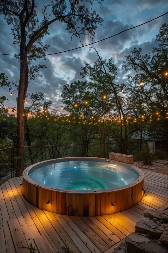 This above ground pool design is absolutely stunning, featuring a unique circular shape nestled in a tranquil woodland setting. The wooden deck surrounding the pool adds a rustic charm, while the warm lighting beneath the pool and along the perimeter creates a soft, inviting glow as night falls. Twinkling string lights above cast a romantic, fairy-tale atmosphere, making it feel like a secret escape hidden away in nature. The overall vibe is peaceful and serene, perfect for unwinding under the stars.