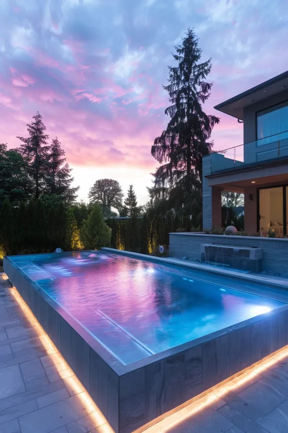 This above ground pool is a stunning mix of modern design and natural beauty. The sleek stone finish around the pool’s edges contrasts perfectly with the vibrant sunset sky, creating a serene and peaceful setting. The soft, warm lighting beneath the pool’s edge highlights its clean lines and adds a welcoming glow to the entire area. Tall trees around the pool give the space a sense of privacy, making it feel like a secluded oasis. The soothing colors of the water and the sky reflect beautifully, offering a calming and luxurious atmosphere.