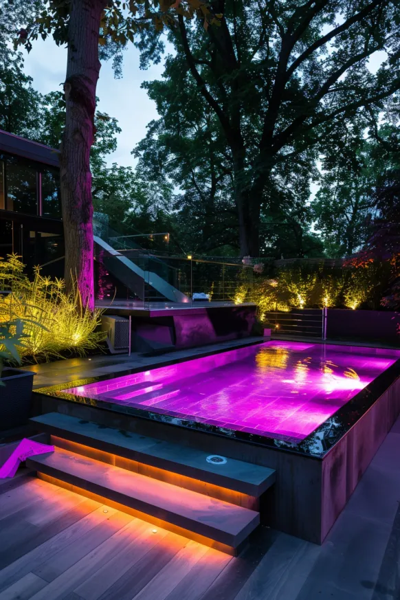 This above ground pool design is all about making a statement. The deep, dark tones of the pool’s sleek stone exterior contrast beautifully with the vibrant, neon purple lighting that illuminates the water, creating a stunning visual effect. The built-in lighting under the pool’s steps adds another layer of sophistication, making the area feel both futuristic and inviting. The surrounding plants, bathed in soft lighting, complement the dramatic atmosphere, while the tall trees in the background enhance the sense of seclusion and tranquility.