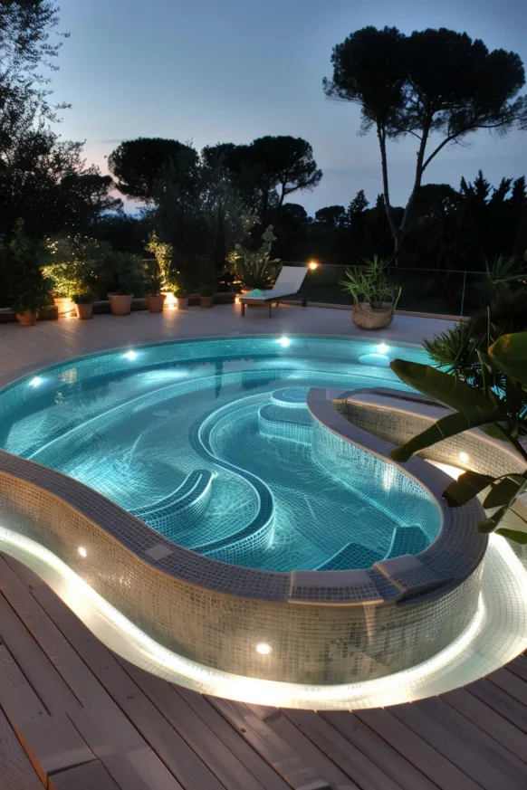 What I absolutely adore about this design is its simplicity and the way the lighting creates such a warm and welcoming vibe. The smooth curve of the pool, combined with the light at its base, feels like a peaceful retreat right at home. It’s a perfect blend of function and style – not too bold, but still incredibly striking. I can just picture myself relaxing by this pool under the stars, surrounded by the soft glow that makes everything feel so serene and elegant!