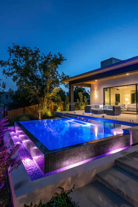 What I love about this design is how effortlessly stylish it feels. The combination of modern lighting and clean, geometric lines gives the pool a chic, high-end vibe. The glowing purple light adds a playful yet sophisticated touch that’s both bold and calming at the same time. It’s the perfect spot to unwind after a long day or host a small get-together. I can totally picture myself lounging by this pool, enjoying the serene lighting and the beauty of the space—talk about backyard goals!