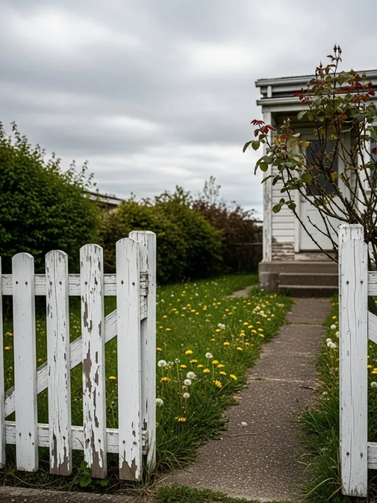 This fence has that classic white picket look with slightly weathered paint that adds instant charm. The worn finish feels intentional and cozy rather than old, especially paired with a narrow garden path and soft greenery. It frames the house gently and creates a welcoming first impression without needing fancy materials.
