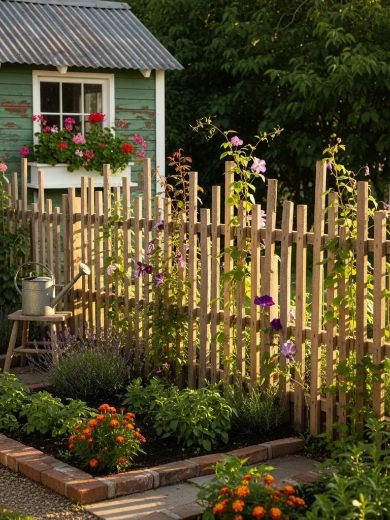This fence features slim wooden slats arranged in a slightly uneven pattern, surrounded by flowers and greenery. The natural wood pairs beautifully with climbing plants and a small garden shed in the background. It feels cheerful, handmade, and full of charm.