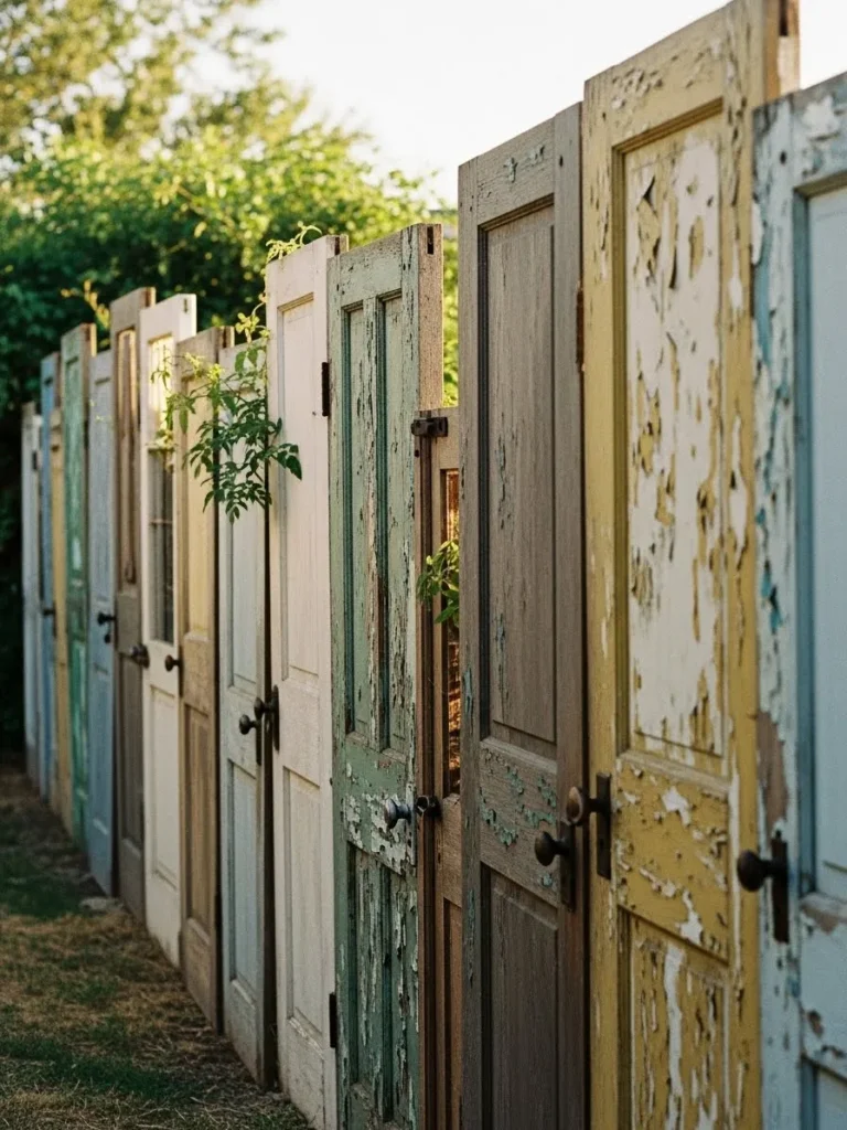 This fence is built from old wooden doors lined up side by side, each with its own color and worn texture. Peeling paint and visible hardware give it a playful and artistic look. It feels eclectic, personal, and totally unique.