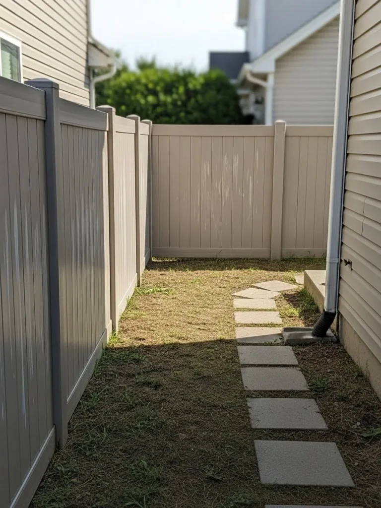 This fence features smooth vinyl panels in a light neutral shade, creating a clean and tidy boundary. The panels are evenly spaced and paired with a narrow stone path. It keeps the area looking neat without needing constant upkeep.