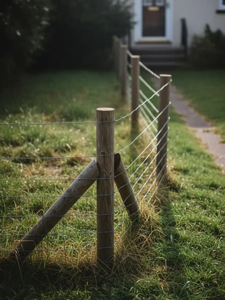 This fence uses thin wire stretched neatly between sturdy wooden posts to create a light and open boundary. The design follows the natural slope of the yard and blends easily into the grass and pathway. It feels practical, low cost, and very understated while still clearly defining the space.