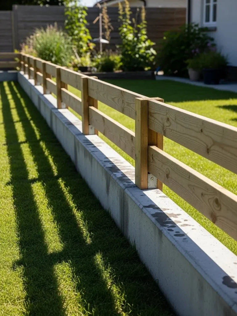 This fence features horizontal wooden rails mounted on a low concrete base. The warm wood tones pair beautifully with the green lawn and surrounding garden plants. It keeps the yard visually open while still creating structure and order.