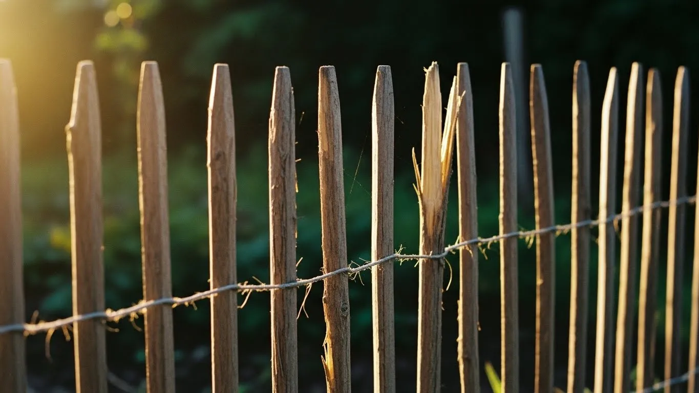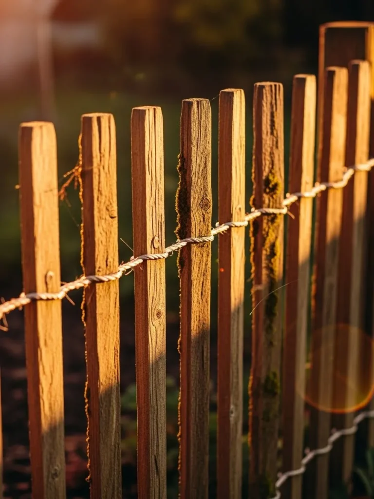 This fence is made from narrow wooden stakes tied together with wire, creating a soft and rustic look. The uneven texture and warm sunlight give it a cozy, countryside feel. It works beautifully in natural gardens or relaxed outdoor spaces.