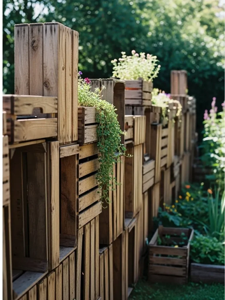 This fence is made from stacked wooden pallets arranged vertically, some holding small plants and greenery. The wood has a natural, slightly rough finish that adds texture and depth. It doubles as a fence and a garden feature at the same time.
