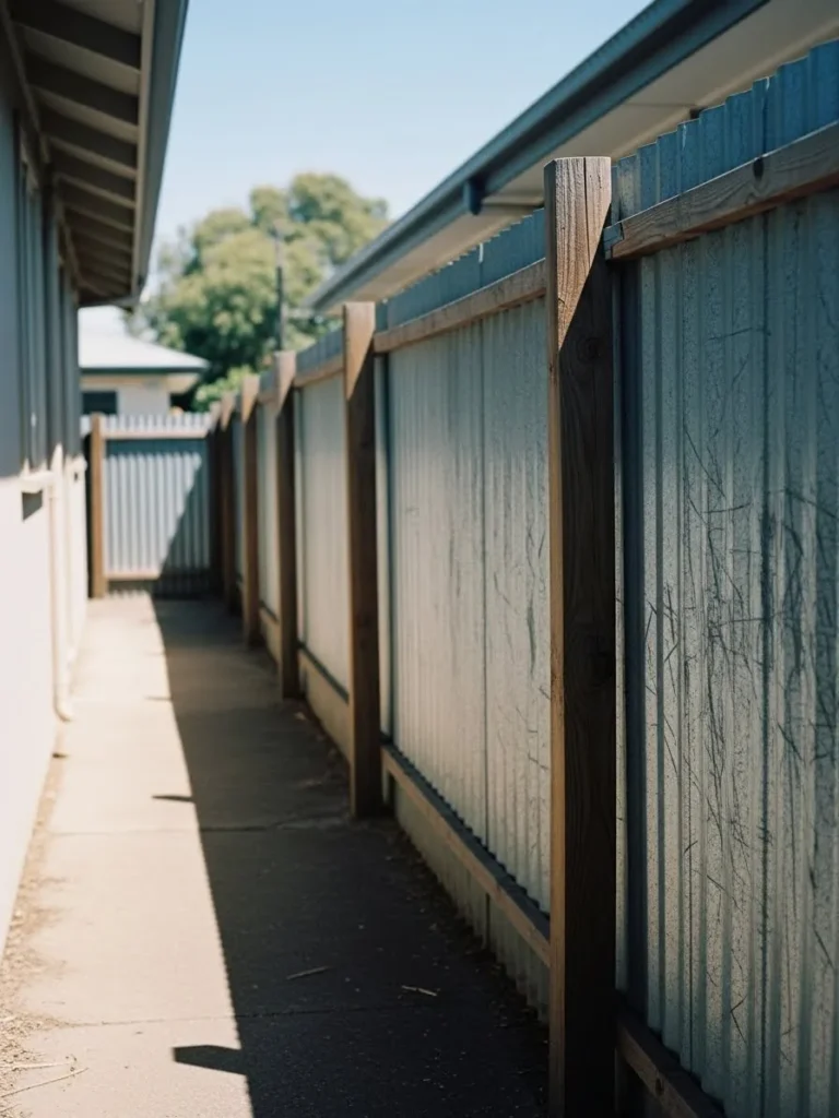 This fence uses basic metal panels combined with wooden posts for a clean and straightforward look. The design is minimal and functional, fitting neatly along the house while creating a sense of privacy. The muted tones keep everything calm and uncluttered.