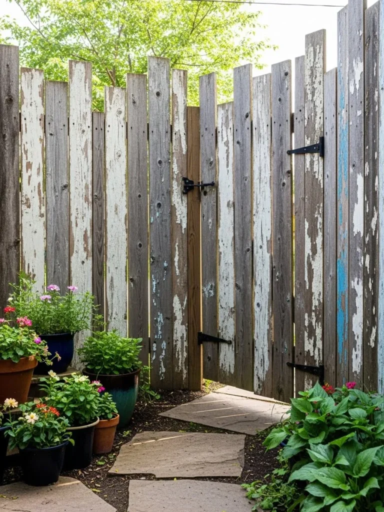 This fence features mismatched wooden planks with peeling paint and visible grain, giving it a rustic and handmade look. The simple gate and stone stepping path add to the casual, creative feel. Nothing looks overly planned, which makes it feel warm and authentic.